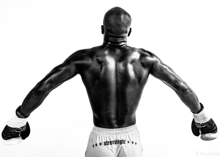 Quelques minutes avant de monter sur le ring, un boxeur se prête à une rapide séance photo. Le fond blanc du mur et la...