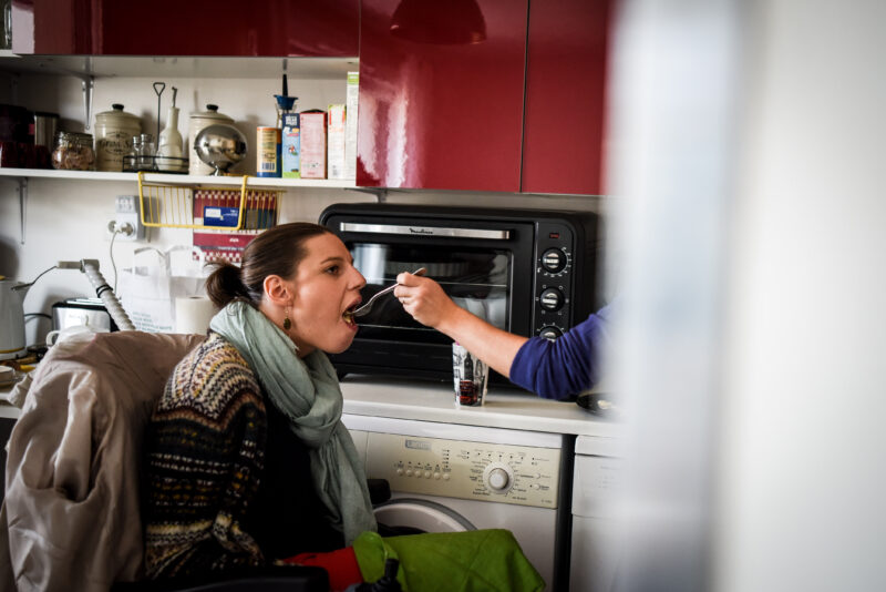 Pourtant, depuis dix ans, Félicie vit chez elle, en parfaite autonomie. Lorsqu’on est en situation de handicap physique, la notion d’autonomie est très importante, puisqu’en effet, celle-ci ne se situe pas dans le fait d’être capable d’accomplir tel ou tel geste, mais bien dans le fait de penser et d’organiser intégralement son quotidien, par l’intermédiaire d’aide humaine, d’aide matérielle, ou encore d’aide animalière.