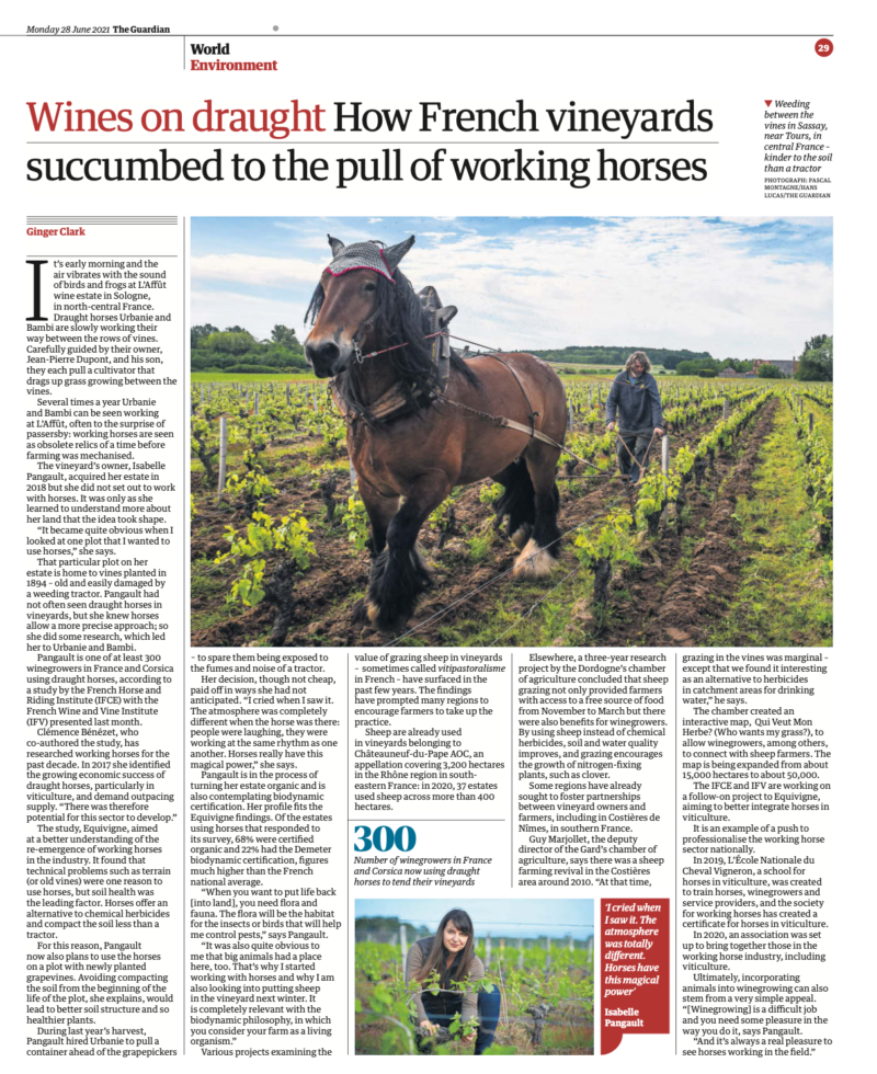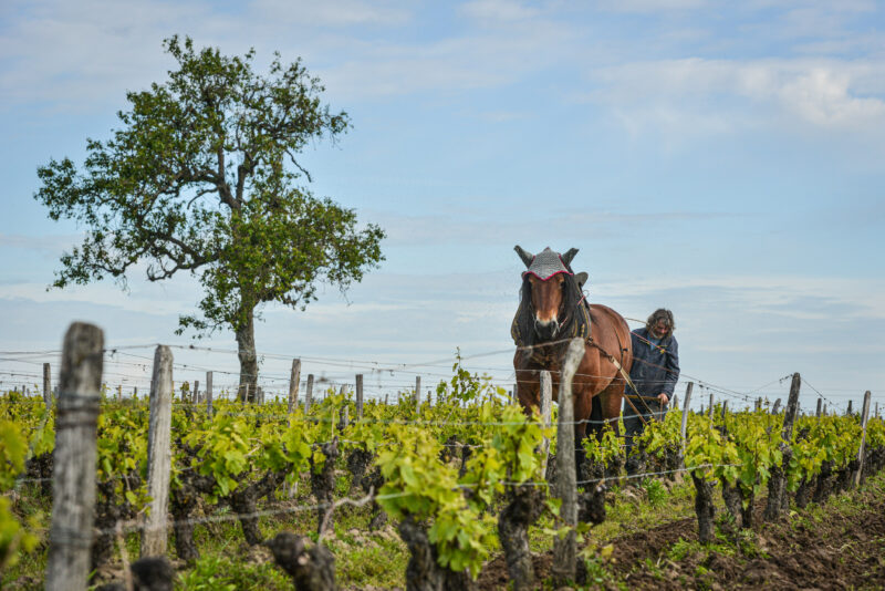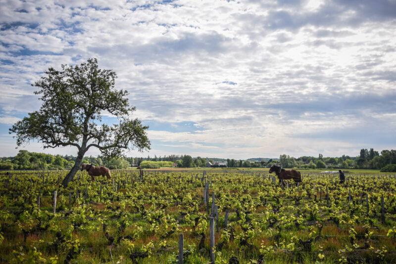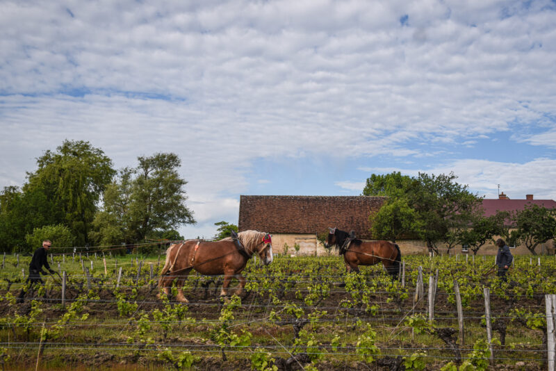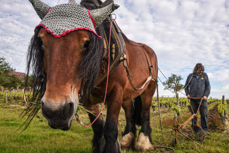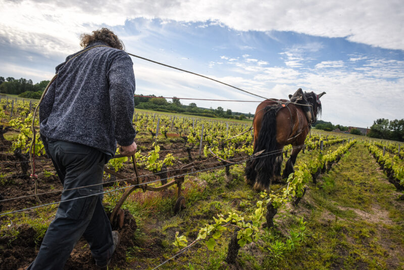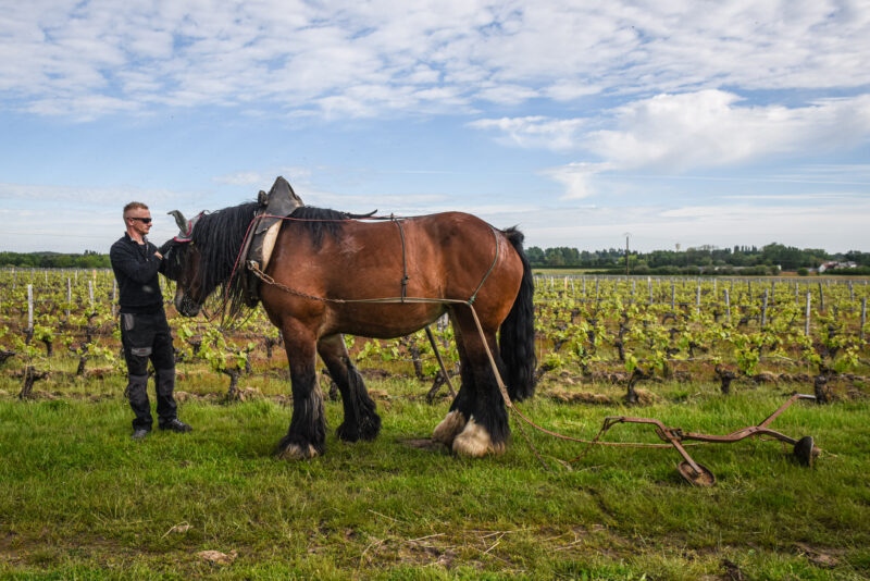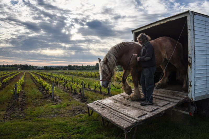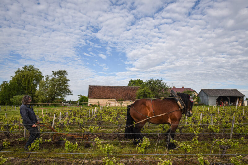 C’est le début de la matinée et l’air vibre du bruit des oiseaux et des grenouilles au domaine viticole de L’Affût, en Sologne, dans le centre-nord de la France. Les chevaux de trait Urbanie et Bambi se frayent lentement un chemin entre les rangées de vignes. Guidés avec soin par leur propriétaire, Jean-Pierre Dupont, et son fils, ils tirent chacun un cultivateur qui arrache l’herbe poussant entre les vignes.