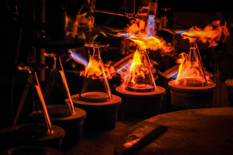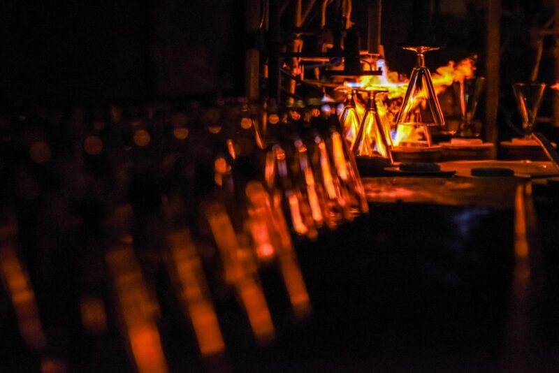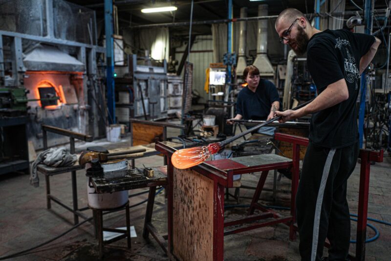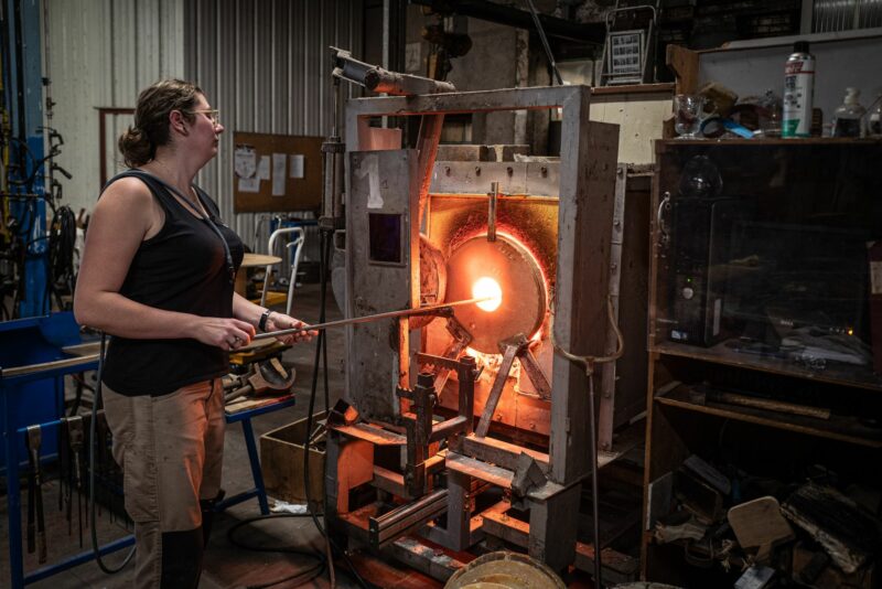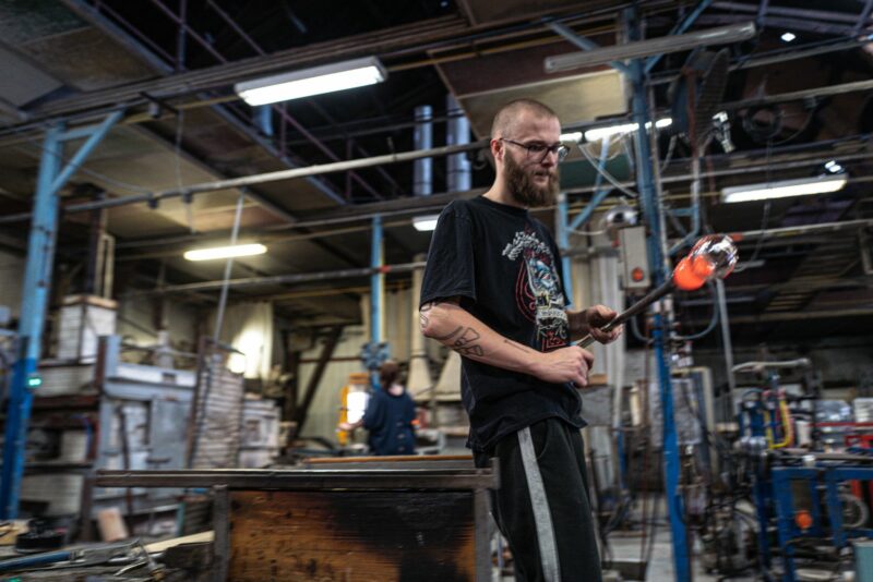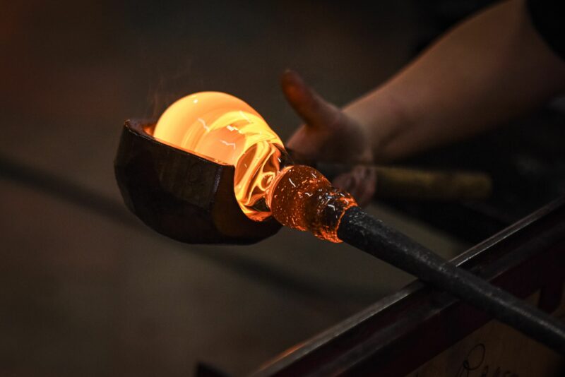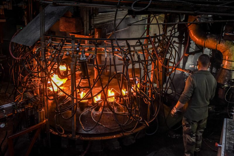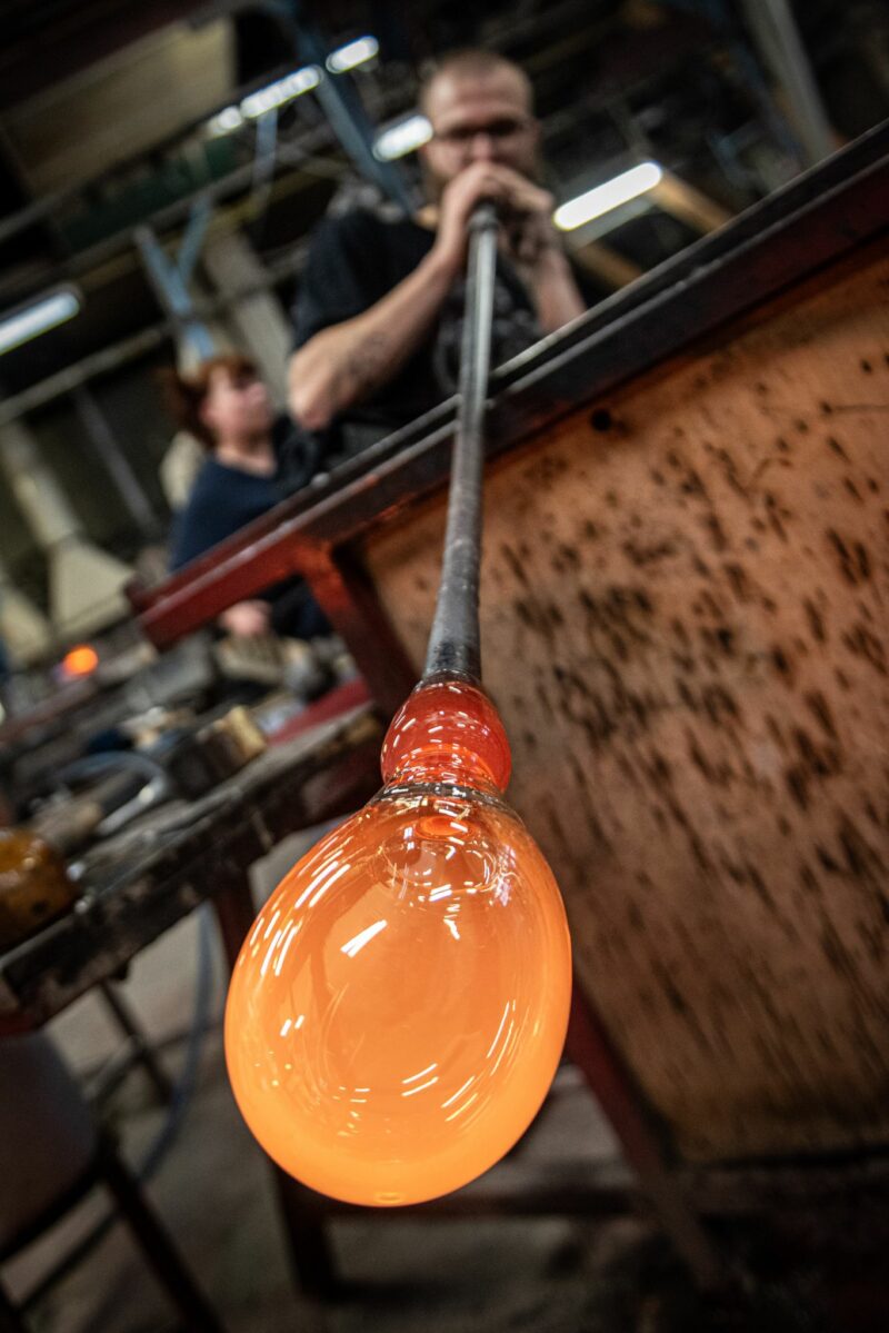 Dans ce petit matin lorrain brumeux, devant le creuset ardent de l’atelier, le maître verrier “cueille” à l’aide de sa canne de fer une petite masse de verre, tel un petit soleil incandescent. Le maître verrier s’affaire immédiatement à la mettre en forme en la “maillochant” dans une sorte de cuillère en bois préalablement mouillée. Le maître verrier entame alors une chorégraphie millimétrée et parfaitement rythmée, le cristal en fusion devant rester suffisamment chaud pour être malléable et suffisamment dur pour garder sa forme. Soufflant une première fois pour créer une première bulle dans le verre, “l’amorce”, il ajoute progressivement un peu de matière, resserre la forme à l’aide d’une pince, pour enfin glisser le tout avec précision dans un moule.